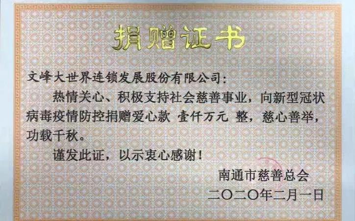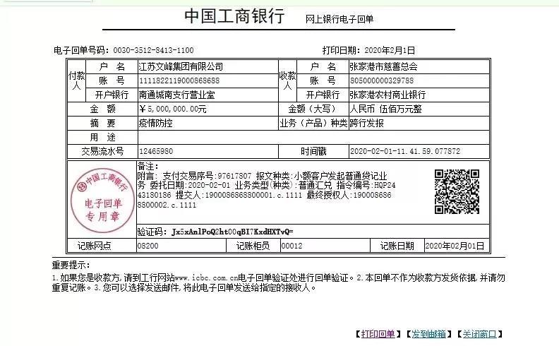 文峰集團、文峰股份各捐資1000萬元,設立疫情專項基金,與所贈慈善總會共同審批資金使用,確保各項資金都用到實處。2月1日上午,2000萬元已匯出。