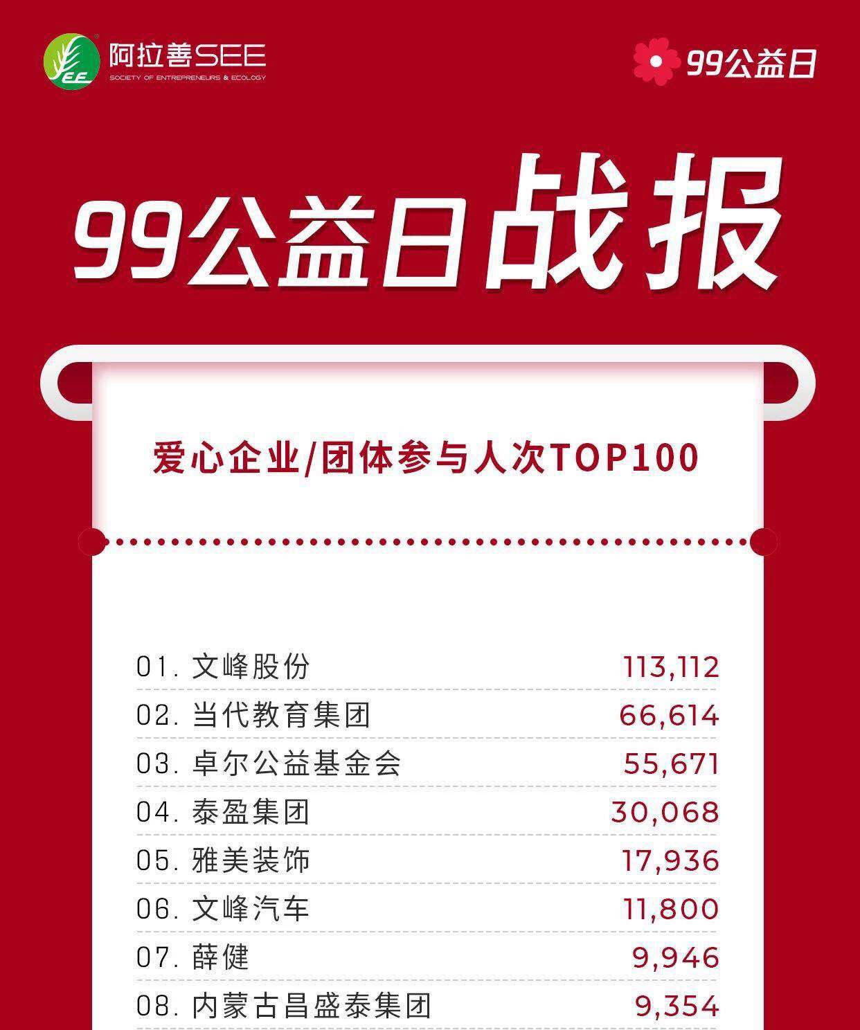 阿拉善SEE的99公益日戰報顯示,江蘇文峰集團獲得134858人次支持,4214180.18元善款。文峰集團旗下文峰股份與阿拉善SEE攜手同行,傳播環保與愛,共計113112人次參與,籌得善款2140000元,兩項指標均位列全國第一;文峰集團旗下的文峰汽車支持的項目得到了11800人次參與,共募得善款近112萬元。