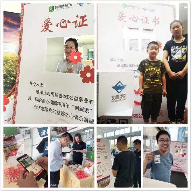 9月7日~9日,華東項目中心會員企業江蘇文峰集團攜手阿拉善SEE,一塊做好事。集團資助了“勁草同行”“創綠家”“任鳥飛”等項目。集團旗下的文峰飯店、南通大飯店、南通文峰城市廣場、上海文峰廣場、大世界百貨、30家文峰汽車4S門店等人流量聚集的商圈,均展出了戶內外LED屏或背景墻、易拉寶、愛心證書等,線下促銷活動也同期向廣大顧客開放。