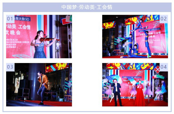 9月11日晚,由南通市崇川區總工會、南通市崇川區和平橋街道工會聯合會、和平橋街道文化站、文峰大世界南通店聯合主辦的“中國夢·勞動美·工會情”聯歡晚會,在文峰大世界南通店門前廣場盛大舉行,為廣大通城市民獻上了一場精彩的文藝演出。